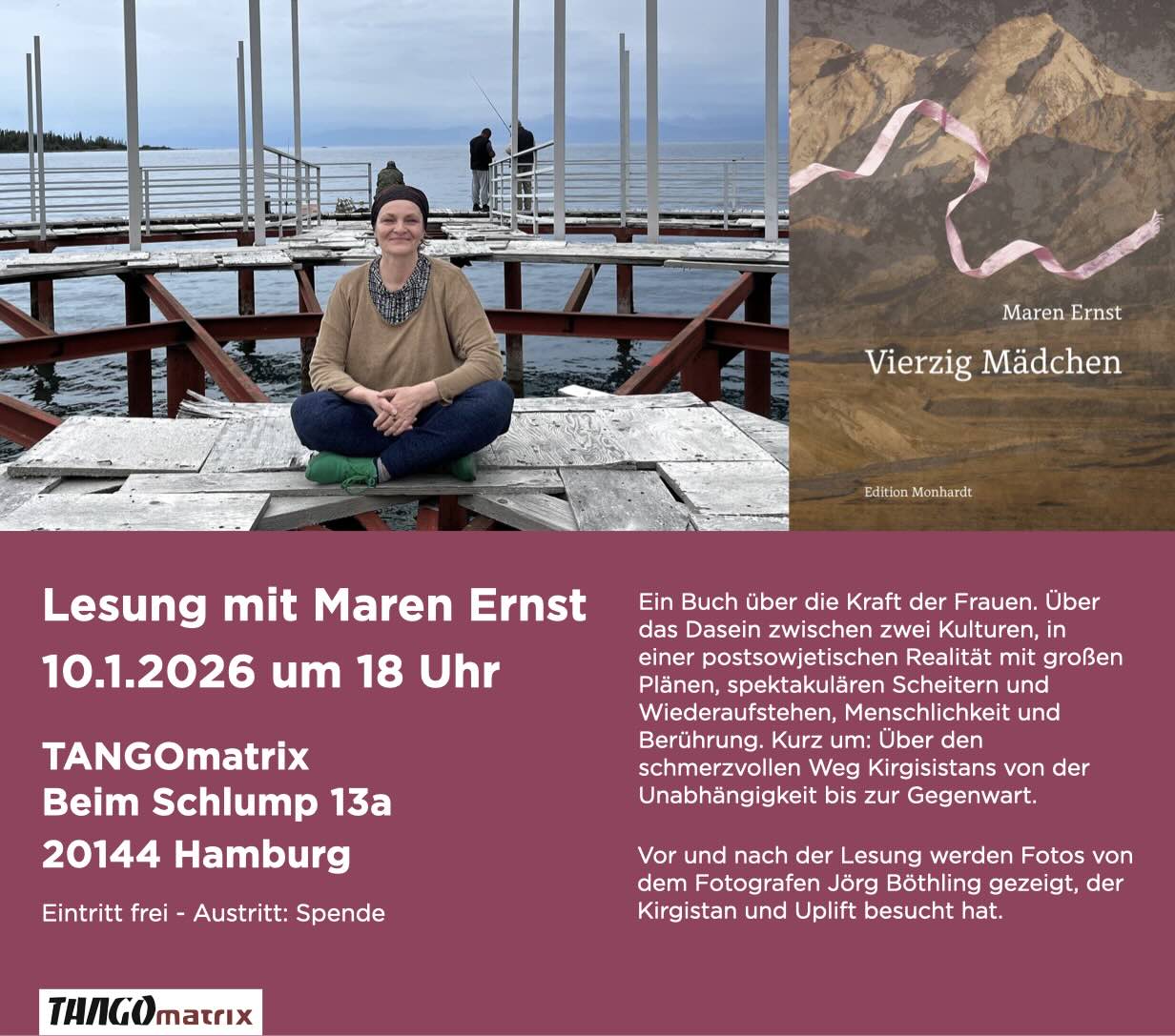 So dreht sich bei der Lesung mit Maren Ernst – moderiert von Dierk Jensen – alles um ihr wunderbares Buch „40 Mädchen“. In diesem dokumentarischen Roman erzählt die Autorin über die Kraft der Frauen in Kirgisistan. Sie gibt lebendige Einblicke in das Dasein zwischen zwei Kulturen, in eine postsowjetische Realität mit großen Plänen, spektakulären Scheitern und Wiederaufstehen, Menschlichkeit und (viel) Berührung. Kurz um: Über den schmerzvollen Weg Kirgisistans von der Unabhängigkeit bis zur Gegenwart.